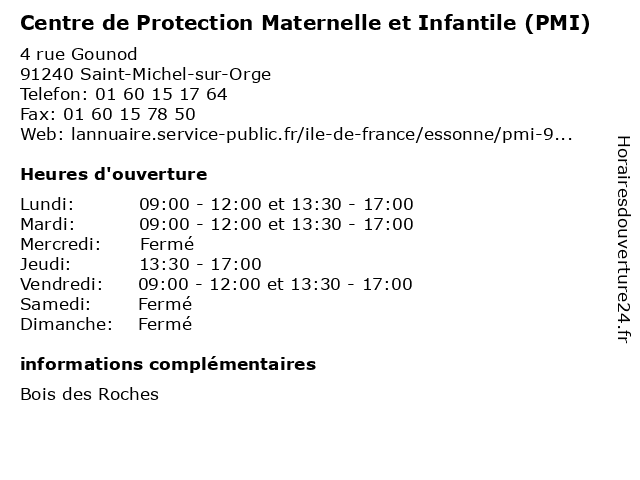 1 Centre de protection maternelle et infantile (PMI) (Distance: 1,33 km) 35 rue de Monlhéry, 91700 Sainte-Geneviève-des-Bois administration, assoc, associations, aux, centre, d'information, de, des, dédié, et, greffe, infantile, information, local, locale, maternelle, mission, personnes, pmi, protection 2 Centre de Protection Maternelle et Infantile (PMI) (Distance: 2,92 km) 60 Rue André Malraux, 91700 Fleury Mérogis administration, assoc, associations, aux, centre, d'information, de, des, dédié, et, greffe, infantile, information, local, locale, maternelle, mission, personnes, pmi, protection 3 Centre de protection maternelle et infantile (PMI) (Distance: 3,01 km) 31 Rue de l'Épargne, 91390 Morsang-sur-Orge centre, conseils, de, et, infantile, maternelle, parents, pmi, protection, prévention, puéricultrice, pédiatre 4 Centre de protection maternelle et infantile (PMI) (Distance: 3,69 km) 18 Place Fédérico Garcia Lorca, 91220 Brétigny-sur-Orge centre, conseils, de, et, infantile, maternelle, parents, pmi, protection, prévention, puéricultrice, pédiatre 5 Centre de protection maternelle et infantile (PMI) (Distance: 6,42 km) 22 Avenue de l'Orme-à-Martin, 91080 Courcouronnes centre, conseils, de, et, infantile, maternelle, parents, pmi, protection, prévention, puéricultrice, pédiatre 6 Centre de protection maternelle et infantile (PMI) (Distance: 6,52 km) 1 Rue Salvadore-Allende, 91180 Saint-Germain-lès-Arpajon bébé, centre, de, et, infantile, maternelle, parents, pmi, protection, puéricultrice, pédiatre, vaccins |