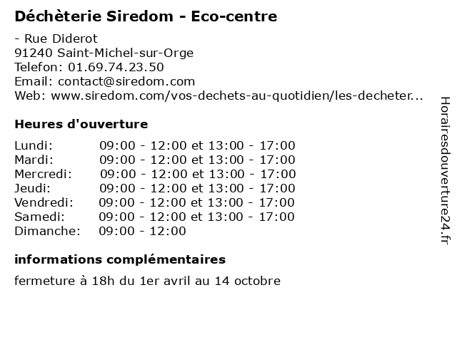 1 Déchèterie Siredom - Eco-centre (Distance: 4,43 km) - Chemin des 50 Arpents, 91180 Saint-Germain-lès-Arpajon centre, centres, collecte, déchets, déchèterie, eco, ménagères, ordures, recyclage, siredom, éco 2 Déchèterie Siredom - Eco-centre (Distance: 5,84 km) - Rue de la Croix Ronde, 91360 Épinay-sur-Orge centre, centres, collecte, déchets, déchèterie, eco, ménagères, ordures, recyclage, siredom, éco 3 Déchèterie Siredom - Eco-centre (Distance: 6,46 km) - Avenue Paul Langevin, 91130 Ris-Orangis centre, centres, collecte, déchets, déchèterie, eco, ménagères, ordures, recyclage, siredom, éco 4 Déchèterie Siredom - Eco-centre (Distance: 9,04 km) - Chemin des Boeufs, 91620 Nozay centre, centres, collecte, déchets, déchèterie, eco, ménagères, ordures, recyclage, siredom, éco 5 Déchèterie Siredom - Eco-centre (Distance: 9,74 km) - voie du Cheminet, 91420 Morangis centre, centres, collecte, déchets, déchèterie, eco, ménagères, ordures, recyclage, siredom, éco 6 Déchèterie Siredom - Eco-centre (Distance: 11,64 km) - Chemin de Port Courcel, 91270 Vigneux-sur-Seine centre, centres, collecte, déchets, déchèterie, eco, ménagères, ordures, recyclage, siredom, éco |