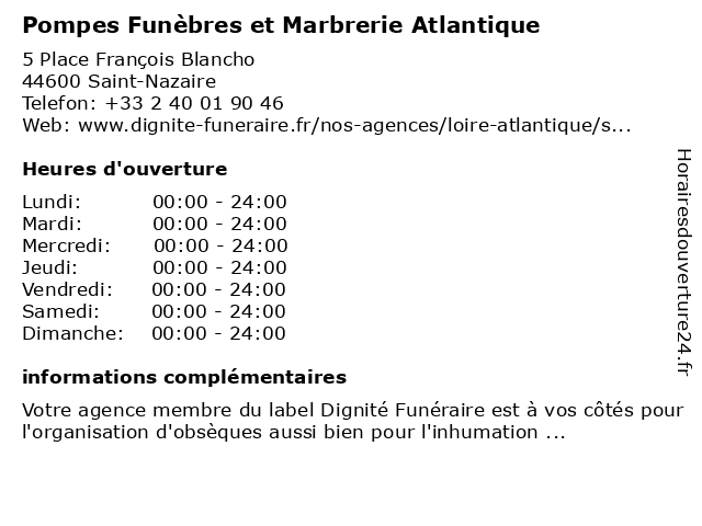 1 Pompes Funèbres et Marbrerie Atlantique (Distance: 4,14 km) 61 Rue de la Vecquerie, 44600 Saint-Nazaire atlantique, avis de décès, crémation, entretien de sépulture, et, fleurs deuil, formalités après obsèques, funèbres, inhumation, marbrerie, monument funéraire, pompes, pompes funèbres, prévoyance obsèques 2 Pompes Funèbres et Marbrerie Atlantique (Distance: 13,29 km) 32 Avenue Jean Mermoz, 44500 La Baule-Escoublac atlantique, avis de décès, crémation, entretien de sépulture, et, fleurs deuil, formalités après obsèques, funèbres, inhumation, marbrerie, monument funéraire, pompes, pompes funèbres, prévoyance obsèques 3 Lecreux Ouest Marbrerie (Distance: 0,00 km) 7 Place François Blancho, 44600 Saint-Nazaire lecreux, marbrerie, ouest 4 Pompes Funèbres Générales (PFG) (Distance: 0,03 km) 1 Place François Blancho, 44600 Saint-Nazaire administration, assoc, associations, aux, bussières, d'information, de, des, dédié, funèbres, greffe, générales, information, local, locale, mairie, mission, personnes, pfg, pompes 5 Atlantique Géomètres Experts A.G.E (Distance: 0,27 km) 10 Rue Louis Pasteur, 44600 Saint-Nazaire a.g.e, atlantique, experts, géomètres 6 DDETS de la Loire-Atlantique - Antenne de Saint-Nazaire (Distance: 0,54 km) 7 Rue Charles Brunelière, 44600 Saint-Nazaire antenne, atlantique, ddets, de, la, loire, nazaire, saint |