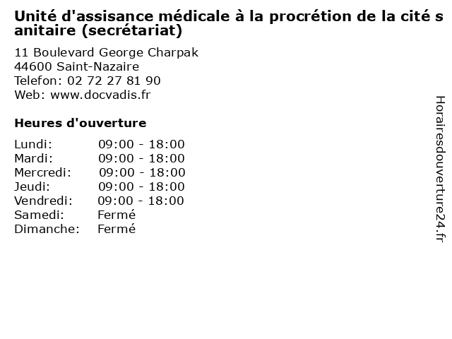 1 Consultations Externes de Médecine Rez de Chaussé Cité Sanitaire - Infectiologie (secrétariat ) (Distance: 0,00 km) 11 boulevard Georges CHARPAK, 44606 Saint-Nazaire chaussé, cité, consultation, consultations, de, docteur, externes, infectiologie, médecine, rez, sanitaire, santé, secrétariat 2 Cité Sanitaire - Centre médicale IRIMED - Site de SAINT-NAZAIRE (Distance: 0,01 km) 11 Boulevard Georges Charpak, 44600 Saint-Nazaire centre, cité, de, irimed, médicale, nazaire, saint, sanitaire, site 3 Unité de Chirurgie et d'Anesthésie Ambulatoire (UCAA) - Centre Hospitalier de Saint-Nazaire (Distance: 0,01 km) 11 Boulevard Georges Charpak, 44600 Saint-Nazaire ambulatoire, centre, chirurgie, d'anesthésie, de, et, hospitalier, nazaire, saint, ucaa, unité 4 Réanimation - Unité de Surveillance Continue - Centre Hospitalier de Saint-Nazaire (Distance: 0,01 km) 11 Boulevard Georges Charpak, 44600 Saint-Nazaire centre, continue, de, hospitalier, nazaire, réanimation, saint, surveillance, unité 5 Cité Universitaire Heinlex (Distance: 0,93 km) 60 Rue Michel Ange, 44600 Saint-Nazaire cité, heinlex, universitaire 6 Cité Universitaire Heinlex (Distance: 0,95 km) 60 Rue Michel Ange, 44600 Saint-Nazaire cité, heinlex, universitaire |