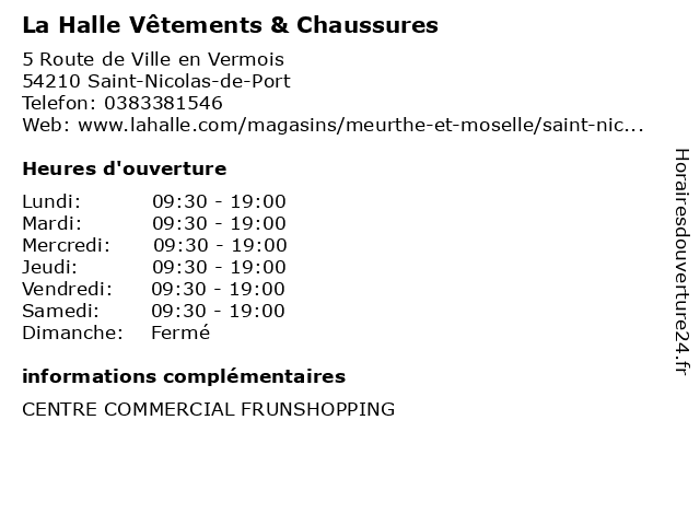 1 La Halle (Distance: 0,79 km) 5 Route de ville en Vermois, 54210 Saint-Nicolas-de-Port accessoires, bons plans, chaussures, chemise, halle, la, la halle, maroquinerie, mode bébé, mode enfant, mode femme, mode homme, pantalon, pas cher, petits prix, promotions, prêt à porter, pull, robe, t shirt, veste, vêtements 2 La Halle (Distance: 4,27 km) n/a Saulcy, 54110 Dombasle-sur-Meurthe bags, child, clothing, halle, la, lingerie, man, shoes, woman 3 La Halle aux Chaussures (Distance: 4,69 km) - Rue Victor Prouvé, 54110 Dombasle-sur-Meurthe accessoires, aux, chaussures, halle, la, maroquinerie 4 La Halle AUX CHAUSSURES (Distance: 9,57 km) 10 Allée du Midi, 54270 Essey-lès-Nancy aux, bags, chaussures, child, clothing, halle, la, lingerie, man, shoes, woman 5 La Halle (Distance: 9,64 km) n/a Allée du Midi, 54270 Essey-lès-Nancy bags, child, clothing, halle, la, lingerie, man, shoes, woman 6 La Halle au Sommeil (Distance: 9,96 km) 18 Rue des Tarbes, 54270 Essey les Nancy accessoires, au, convertibles, halle, la, matelas, sommeil, sommiers |