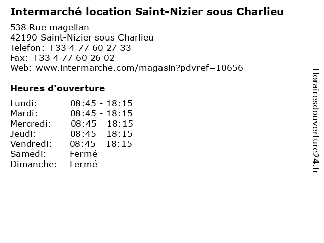 1 Intermarché SUPER Saint-Nizier sous Charlieu (Distance: 0,00 km) 538 Rue magellan, 42190 Saint-Nizier sous Charlieu charlieu, intermarché, nizier, saint, sous, super 2 Intermarché station-service Saint-Nizier sous Charlieu (Distance: 0,14 km) 538 Rue Magellan, 42190 Saint-Nizier-sous-Charlieu charlieu, intermarché, nizier, saint, service, sous, station 3 Intermarché CONTACT Charlieu (Distance: 1,26 km) Route du Beaujolais, 42190 Charlieu charlieu, contact, intermarché 4 Intermarché station-service Charlieu (Distance: 1,29 km) Chemin de la Montalay, 42190 Charlieu charlieu, intermarché, service, station 5 Carrefour Location (Distance: 12,29 km) - Rue Jean de la Fontaine, 42300 Mably agence, carrefour, location, utilitaires, véhicules 6 Intermarché location Riorges (Distance: 12,99 km) 480 Avenue charles de gaulle, 42153 Riorges intermarché, location, riorges |