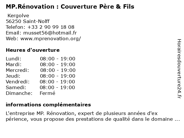 1 La Maison de la Couverture (Distance: 1,90 km) Les Bruyères, 56250 Saint-Nolff couverture, de, la, maison 3 Le Bouedec Couverture (Distance: 4,95 km) 2 Rue du Général Baron Fabre, 56000 Vannes bouedec, charpentier, couverture, couvreur, le, toit, toiture 4 Bernard Le Métayer Et Fils Ets (Distance: 5,04 km) Saint-Léonard, 56450 Theix-Noyalo bernard, et, ets, fils, le, métayer 5 Protoit Couverture (Distance: 5,16 km) 10bis avenue Geispolsheim, 56860 Séné couverture, couvreur, entretien, protoit, réparation, toit, toiture 6 |