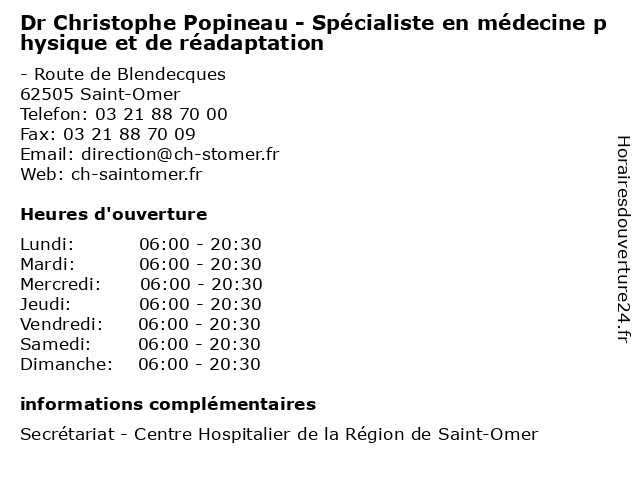 1 Dr Hugues Melliez - Spécialiste en médecine interne (Distance: 0,00 km) - Route de Blendecques, 62505 Saint-Omer consultation, docteur, dr, en, hugues, interne, med, melliez, médecin, médecine, spécialiste, traitement 2 Dr Antoine Ferenczi - Spécialiste en médecine physique et de réadaptation (Distance: 0,00 km) - Route de Blendecques, 62505 Saint-Omer antoine, consultation, de, docteur, dr, en, et, ferenczi, med, médecin, médecine, physique, réadaptation, spécialiste, traitement 4 Manège (En période scolaire) (Distance: 0,60 km) 2 Avenue des Frais Fonds, 62219 Longuenesse auchan, centre, commercial, en, longuenesse, manège, période, scolaire 5 Manège (En période de vacances scolaires) (Distance: 0,60 km) 2 Avenue des Frais Fonds, 62219 Longuenesse auchan, centre, commercial, de, en, longuenesse, manège, période, scolaires, vacances 6 Lecoq En Papillote (Distance: 0,99 km) 8 Eue de Thérouanne, 62500 Saint-Omer café, en, lecoq, papillote, restaurants |