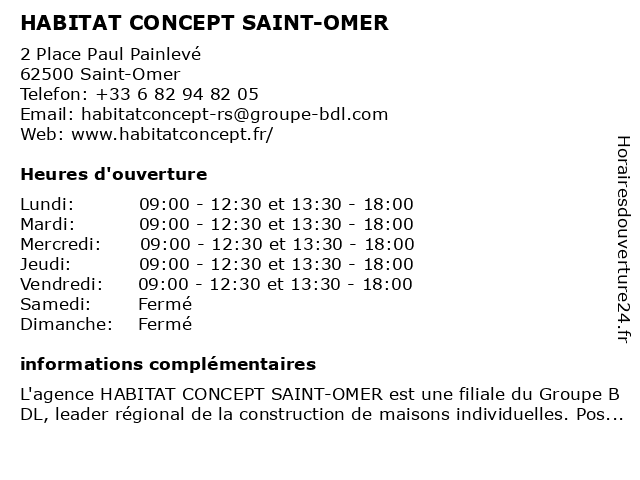 1 HABITAT CONCEPT SAINT-OMER (Distance: 0,00 km) 2 Place Paul Painlevé, 62500 Saint-Omer concept, habitat, omer, saint 2 HABITAT CONCEPT SAINT-OMER (Distance: 0,00 km) 2 Place Paul Painlevé, 62500 Saint-Omer concept, habitat, omer, saint 3 Construction Bois Habitat (Distance: 0,48 km) 60 Rue Carnot, 62500 Saint-Omer bois, construction, habitat, maison, pierre, saint-omer, wasselin 4 Square Habitat (Distance: 0,79 km) 79 rue d'Arras, 62503 Saint-Omer agences, habitat, immo, immobilier, location, square 5 Habitat Concept (Distance: 1,89 km) 42 Place de la Mélodie, 62219 Longuenesse concept, constructeur, construction, habitat, maisons, neuve, projet 6 Veolia Habitat Services (Distance: 2,24 km) . Route de Boulogne, 62500 Tatinghem aménagement, equipement .services, habitat, services, veolia |