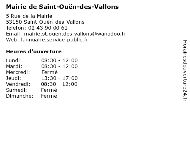 Termes de recherche pour Mairie de Saint-Ouën-des-Vallons:de, saint, ouen, des, administration, mairie, vallons, assoc public |