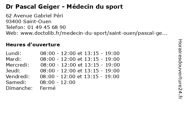 1 Dr Pascal Geiger - Médecin du sport (Distance: 2,25 km) 89 Avenue des Grésillons, 92230 Gennevilliers docteur, dr, du, geiger, médecin, pascal, sport 2 Dr Pascal Geiger - Médecin du sport (Distance: 4,73 km) 2 Mail de l'Egalité, 93120 La Courneuve dr, du, geiger, médecin, médecine, médical, pascal, pharmaceutique, secrétariat, sport, traitement 3 Dr Pascal Geiger - Médecin du sport (Distance: 7,90 km) 38 Boulevard Saint-Marcel, 75005 Paris consultation, docteur, dr, du, geiger, med, médecin, médecine, pascal, secrétariat, sport, traitement 4 Dr Stéphane Cascua - Médecin du sport (Distance: 0,00 km) 62 Avenue Gabriel Péri, 93400 Saint-Ouen cascua, consultation, docteur, dr, du, med, médecin, sport, stéphane, traitement 5 ABC Pascal (Distance: 0,93 km) 85 Rue des Rosiers, 93400 Saint-Ouen abc, antiquaire, boutique., pascal 6 Berro Pascal (Distance: 0,93 km) 85 Rue des Rosiers, 93400 Saint-Ouen antiquaire, berro, mobilier., pascal |