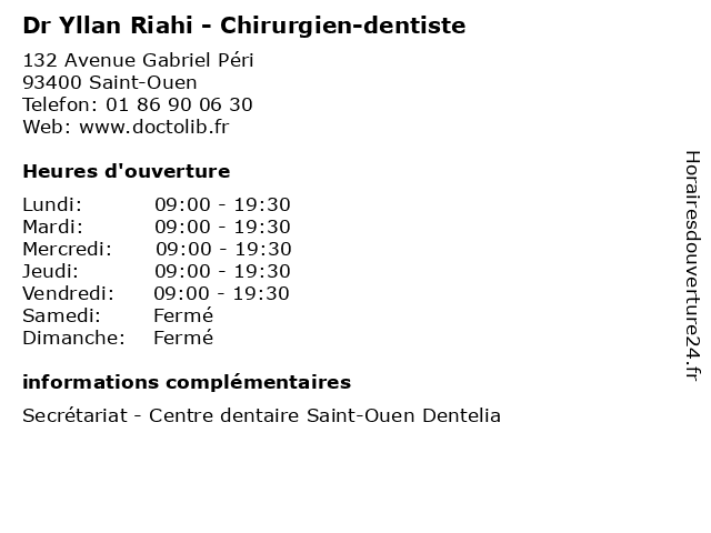 1 Dr Yllan Riahi - Chirurgien-dentiste (Distance: 1,10 km) 132 Avenue Gabriel Péri, 93400 Saint-Ouen chirurgie, chirurgien, dentaire, dentiste, dr, riahi, yllan 2 Dr Yllan Riahi - Chirurgien-dentiste (Distance: 9,82 km) 80 Rue Maurice Thorez, 92000 Nanterre chirurgien, consultation, dentiste, docteur, dr, med, médecin, riahi, traitement, yllan 3 Dr Yllan Riahi - Chirurgien-dentiste (Distance: 9,99 km) 80 Rue Maurice Thorez, 92000 Nanterre chirurgie, chirurgien, dentaire, dentiste, dr, riahi, yllan 4 Maître Karine Riahi - Avocate (Distance: 3,48 km) 42 rue Vignon, 75009 Paris avocate, avocats, cabinet, conseils, contentieux, juridique, justice, karine, litiges, maître, riahi, services 5 Dr Mickael Riahi - Médecin généraliste (Distance: 3,98 km) 3 Rue Euryale Dehaynin, 75019 Paris docteur, dr, generaliste, généraliste, medical, mickael, médecin, riahi, soin 6 Maître Julien Riahi - Avocat (Distance: 4,24 km) 40 rue François 1er, 75008 Paris avocat, avocats, cabinet, conseils, contentieux, julien, juridique, justice, litiges, maître, riahi, services |