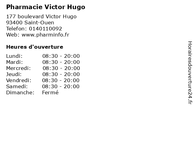 1 Pharmacie Victor Hugo (Distance: 1,98 km) 73 rue Victor Hugo, 92300 Levallois Perret herboristerie, hugo, médicaments, paramédical, parapharmacie, pharmacie, pharmacien, santé, traitements, victor 2 Pharmacie Victor Hugo (Distance: 2,75 km) 5 Rue Victor Hugo, 92230 Gennevilliers consultations, hugo, médicaments, pharmacie, victor, vitamines 3 Pharmacie Victor Hugo (Distance: 5,11 km) 52 rue Louis Blanc, 92400 Courbevoie homéopathie, hugo, médicaments, orthopédie, parapharmacie, pharmacie, victor 4 Pharmacie Victor Hugo (Distance: 8,91 km) 50 Avenue Victor Hugo, 92100 Boulogne Billancourt herboristerie, hugo, médicaments, paramédical, parapharmacie, pharmacie, pharmacien, santé, traitements, victor 5 Les Estudines Victor Hugo (Distance: 0,09 km) 171 Boulevard Victor Hugo, 92110 Clichy estudines, hugo, les, logement, résidence, student, universitaire, victor, étudiant, étudiante 6 Babilou Saint-Ouen Hugo (Distance: 0,23 km) 141 Avenue victor hugo, 93400 SAINT OUEN babilou, hugo, ouen, saint |