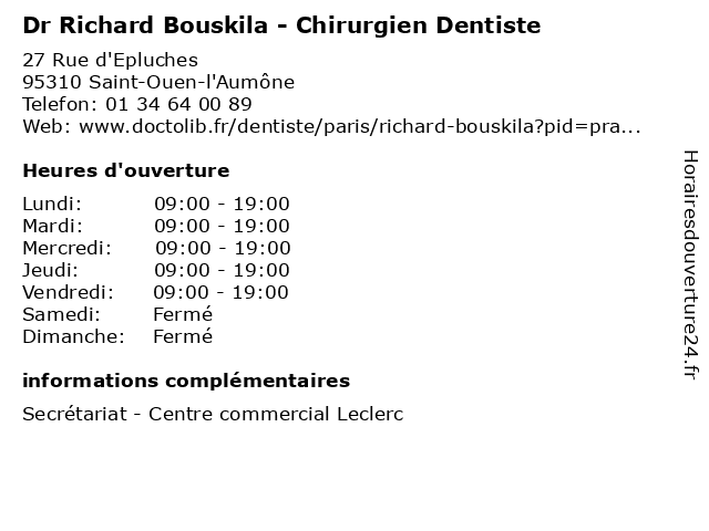 Termes de recherche pour Dr Richard Bouskila - Chirurgien Dentiste:leclerc, saint, ouen, commercial, centre, richard, dr, dentiste, chirurgien, aumone, bouskila, 95310 |