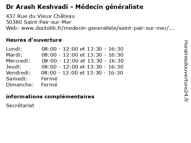 | Jeudi | 08:00-12:00 et 13:30-16:30 |