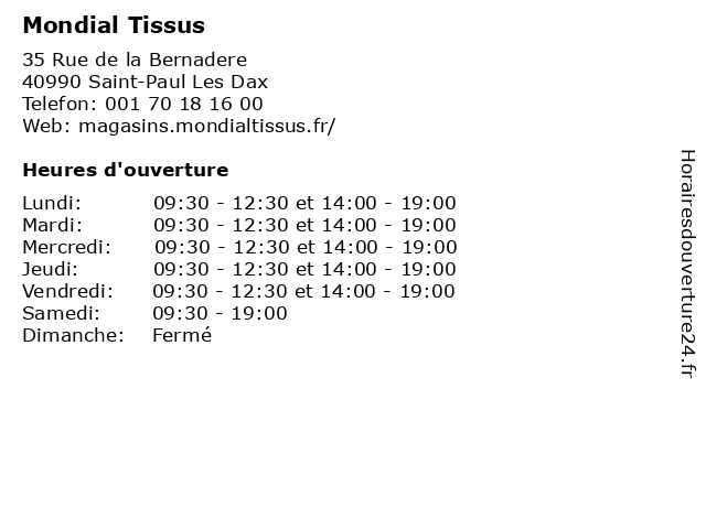 | Mardi | 09:30-12:30 et 14:00-19:00 |