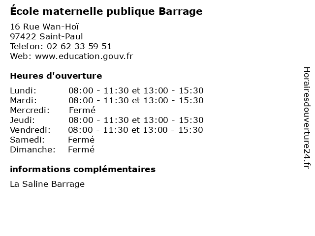1 École primaire publique Barrage (Distance: 0,31 km) 130 Chemin Acadine, 97422 Saint-Paul barrage, cours, education, primaire, publique, services, École, école 2 Ecole Elémentaire Publique barrage - Saint-Paul (Distance: 0,56 km) 130 rue Acadine, 97422 Saint-Paul barrage, ecole, education, elémentaire, maternelle, paul, publique, saint, services 3 Ecole Maternelle Publique barrage - Saint-Paul (Distance: 0,56 km) 130 rue Acadine, 97422 Saint-Paul barrage, ecole, education, maternelle, paul, publique, saint, services 4 École maternelle publique Les Capucines (Distance: 1,97 km) 34 Rue François de Mahy, 97426 Les Trois-Bassins capucines, cours, les, maternelle, publique, servicios, école 5 École maternelle publique Montvert (Distance: 3,49 km) 16 Chemin des Tamarins, 97426 Les Trois-Bassins cours, education, maternelle, montvert, publique, services, École, école 6 École maternelle publique Auguste Lacaussade (Distance: 12,90 km) 10 Rue Rivière, 97419 La Possession auguste, cours, lacaussade, maternelle, publique, servicios, école |