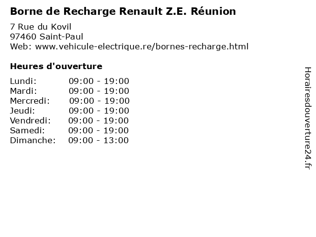 1 Borne de Recharge Renault Z.E. Réunion (Distance: 4,16 km) 11 Route des Premiers Français, 97460 Saint-Paul borne, de, point, recharge, renault, réunion, z.e., électrique 2 Borne de Recharge Renault Z.E. Réunion (Distance: 4,51 km) 5f Avenue de la Palestine, 97419 La Possession borne, de, point, recharge, renault, réunion, z.e., électrique 3 Borne de Recharge Renault Z.E. Réunion (Distance: 5,04 km) 22 Rue Claude Chappe, 97420 Le Port borne, de, point, recharge, renault, réunion, z.e., électrique 4 Borne de Recharge Renault Z.E. Réunion (Distance: 5,42 km) 15 Rue Charles Darwin, 97420 Le Port borne, de, point, recharge, renault, réunion, z.e., électrique 5 Borne de Recharge Renault Z.E. Réunion (Distance: 11,91 km) - route des Tamarins, 97411 Saint-Paul borne, de, point, recharge, renault, réunion, z.e., électrique 6 Borne de Recharge Renault Z.E. Réunion (Distance: 12,59 km) - Lot Les sables blonds, 97434 Saline-Les-Bains borne, de, point, recharge, renault, réunion, z.e., électrique |