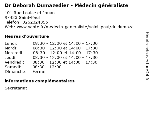 1 Dr Marie-Cecile Breuil - Médecin généraliste (Distance: 0,00 km) 82 Rue Du General De Gaulle, 97434 Saint-Paul breuil, cecile, consultation, docteur, dr, généraliste, marie, med, médecin, traitement 2 Dr Jean-Luc Labat - Médecin généraliste (Distance: 4,62 km) 35 Chemin de la Bretelle, 97435 Saint-Paul consultation, docteur, dr, généraliste, jean, labat, luc, med, médecin, traitement 3 Dr Patricia Legouareguer - Médecin généraliste (Distance: 5,09 km) 134 Rue Montrouge, 97460 Saint-Paul consultation, docteur, dr, généraliste, legouareguer, med, médecin, patricia, traitement 4 Dr Antoine Moreau - Médecin généraliste (Distance: 6,07 km) 28 Rue Roland Garros, 97411 Saint-Paul antoine, consultation, docteur, dr, généraliste, med, moreau, médecin, traitement 5 Dr Valerie Dautricourt - Médecin généraliste (Distance: 7,05 km) 28 Chemin des Combavas, 97411 Saint-Paul consultation, dautricourt, docteur, dr, généraliste, med, médecin, traitement, valerie 6 Dr Jean-Loup Noel - Médecin généraliste (Distance: 7,22 km) 86 ter Rue Joseph Hubert, 97435 Saint-Paul consultation, docteur, dr, généraliste, jean, loup, med, médecin, noel, traitement |