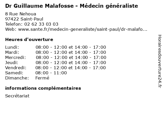 | Mercredi | 08:00-12:00 et 14:00-17:00 |