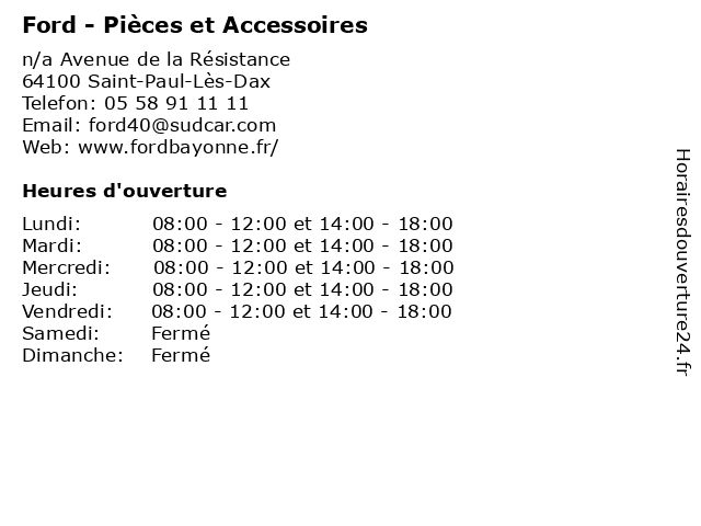 1 Ford - Véhicules Neufs (Distance: 0,00 km) n/a Avenue de la Résistance, 64100 Saint-Paul-Lès-Dax atelier de carrosserie, auto, car, financement, ford, ford entreprise, neufs, pièces et accessoires, véhicules, véhicules d’occasion, véhicules neufs 2 Ford - Véhicules d’Occasion (Distance: 0,00 km) n/a Avenue de la Résistance, 64100 Saint-Paul-Lès-Dax atelier de carrosserie, auto, car, d’occasion, financement, ford, ford entreprise, pièces et accessoires, véhicules, véhicules d’occasion, véhicules neufs 3 Ford - Ford Entreprise (Distance: 0,00 km) n/a Avenue de la Résistance, 64100 Saint-Paul-Lès-Dax atelier de carrosserie, auto, car, entreprise, financement, ford, ford entreprise, pièces et accessoires, véhicules d’occasion, véhicules neufs 4 Ford - Entretien (Distance: 0,00 km) n/a Avenue de la Résistance, 64100 Saint-Paul-Lès-Dax atelier de carrosserie, auto, car, entretien, financement, ford, ford entreprise, pièces et accessoires, véhicules d’occasion, véhicules neufs 5 Ford - Administration (Distance: 0,00 km) n/a Avenue de la Résistance, 64100 Saint-Paul-Lès-Dax administration, atelier de carrosserie, auto, car, financement, ford, ford entreprise, pièces et accessoires, véhicules d’occasion, véhicules neufs 6 Ford - General (Distance: 0,00 km) n/a Avenue de la Résistance, 64100 Saint-Paul-Lès-Dax atelier de carrosserie, auto, car, financement, ford, ford entreprise, general, pièces et accessoires, véhicules d’occasion, véhicules neufs |