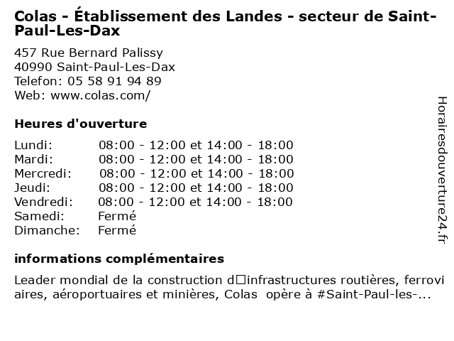 Termes de recherche pour Colas - Établissement des Landes - secteur de Saint-Paul-Les-Dax:les, de, saint, dax, paul, des, landes, colas, secteur, etablissement, entreprise générale de construction |