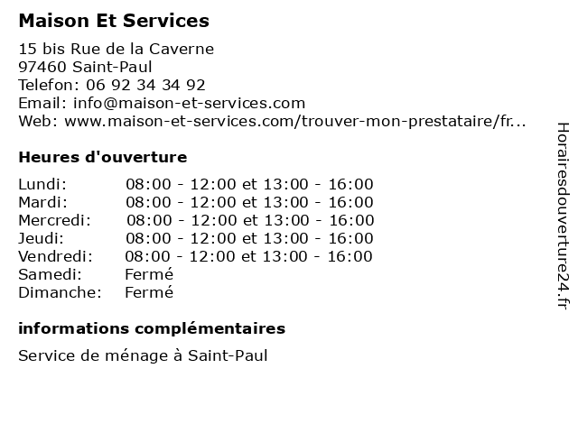 1 Maison & Services (Distance: 0,00 km) 15 Bis Rue de la Caverne, 97411 Saint-Paul et, maison, ménage, nettoyages, repassage, services, vitres 2 Kaz'Ado Ouest - Maison des Adolescents (Distance: 0,16 km) 31 bis Rue Labourdonnais, 97460 Saint-Paul adolescents, des, kaz'ado, maison, ouest 3 Kaz Expo (Distance: 0,30 km) 24 Rue Ibrahim Balbolia – 8 Terrasses des Rampes, 97460 Saint-Paul 974, constructeur, construction, construire, expo, kaz, maison, réunion 4 Kaz Expo (Distance: 0,30 km) 24 Rue Ibrahim Balbolia – 8 Terrasses des Rampes, 97460 Saint-Paul 974, constructeur, construction, construire, expo, kaz, maison, réunion 5 Ravate Brico (Distance: 4,04 km) 45 Rue du Kovil, 97460 Saint-Paul brico, bricolage, bâtiment, maison, quincaillerie, ravate, équipement 6 Ravate Déco (Distance: 4,04 km) 45 Rue du Kovil, 97460 Saint-Paul bricolage, bâtiment, déco, maison, quincaillerie, ravate, équipement |