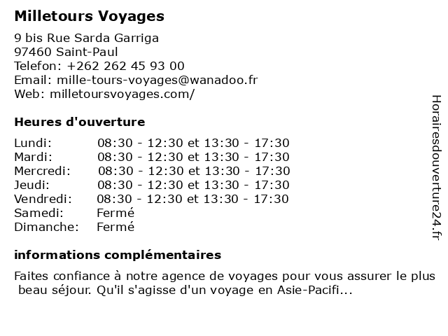1 Mille Tours Voyages (Distance: 0,02 km) 9bis Rue Sarda Garriga, 97460 Saint-Paul agence, circuits, hôtel, mille, réservations, séjours, tours, vacances, vol, voyages 2 Bourbon Voyages (Distance: 0,35 km) 113 Chaussée Royale, 97460 Saint-Paul agence, bourbon, circuit, hôtel, séjour, voyage, voyages 3 Holiday Voyages (Distance: 0,92 km) 169 Chaussée Royale, 97460 Saint-Paul agence, circuits, holiday, hôtel, réservations, séjours, vacances, vol, voyages 4 Transcontinents Voyages (Distance: 3,62 km) 6bis Route de Savannah, 97460 Saint-Paul agence, circuits, hôtel, réservations, séjours, transcontinents, vacances, vol, voyages 5 Alizoa Voyages (Distance: 6,74 km) 2 Rue du Port, 97434 Saint-Gilles les Bains agence, alizoa, circuits, hôtel, réservations, séjours, vacances, vol, voyages 6 Bourbon Voyages (Distance: 7,55 km) 6 rue Saint Paul, 97420 Le Port agence, bourbon, circuit, hôtel, séjour, voyage, voyages |
