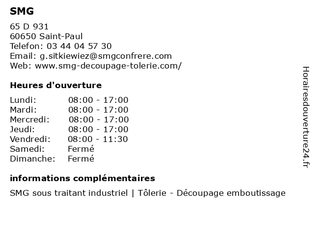 1 Ferart (Distance: 21,95 km) Rue de la petite campagne, 60730 Sainte-Geneviève acier, aluminium, chaudronnerie, contrôle, décapage, ferart, ferronnerie, inox, métallerie, pliage, tôlerie fine 2 SMG Isolation Thermique (Distance: 23,99 km) 1 Rocade des Acacias, 60110 Méru isolation, smg, thermique 3 Sous-Préfecture (Distance: 30,08 km) 6 Rue Georges-Fleury, 60607 Clermont administration, assoc, préfecture, services, services publics, sous 4 FF Déco (Distance: 34,70 km) 459 Grand' rue, 60130 Le Plessier-sur-Saint-Just art, deco, déco, fer forgé, ferronnerie d'art, ff, métallerie, tabourets, tôlerie 5 Les Ateliers Vauzelle (Distance: 43,51 km) 99 Rue Nationale, 95000 Cergy, France aluminium, art, artisan, ateliers, ferronnerie, les, métallurgie, tôlerie, vauzelle 6 OTELO SA (Distance: 44,30 km) 11 Avenue du Fief, 95310 Saint-Ouen-l'Aumône affûtage, otelo, outillage, professionnel, sa, tôlerie |