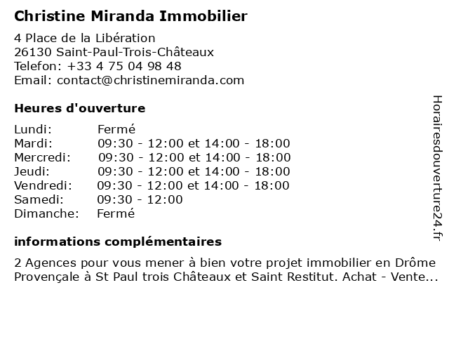 1 Miranda Christine Immobilier (Distance: 0,00 km) 1 Avenue du Général de Gaulle, 26130 Saint-Paul-Trois-Châteaux christine, immobilier, miranda 2 Dr Christine Fabre - Allergologue (Distance: 24,98 km) - avenue Alphonse Daudet, 30205 Bagnols-sur-Cèze allergie, allergologie, allergologue, christine, dr, fabre, pneumologie, pneumologue 3 Madame Christine Poutrel (Distance: 28,30 km) Quartier Vacheresse, 07400 Alba La Romaine bailleurs, biens, christine, immobiliers, madame, nra, poutrel 4 Pourpre Knoploch Christine (Distance: 42,53 km) 2 Rue Montlaur, 07200 Aubenas christine, knoploch, pourpre, restaurants 5 Belmonte Vassallo Christine (Distance: 43,17 km) Zone Industrielle Le Lac, 07000 Privas belmonte, boulangeries, christine, détail, vassallo 6 Pichon Christine (Distance: 44,36 km) La Pause Gourmande, 62231 Coquelles christine, pichon, restaurants |