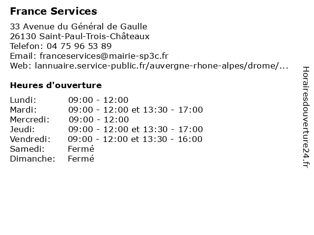 1 France Services (Distance: 7,36 km) 7 Rue Émile Zola, 84500 Bollène administration, communes, france, service, services, services publics 2 France Services (Distance: 9,84 km) 2 Avenue du Maréchal Leclerc, 07700 Bourg-Saint-Andéol administration, communes, france, service, services, services publics 3 France Services (Distance: 11,15 km) 47 Place du Portail-du-Rhône, 07700 Saint-Marcel-d'Ardèche administration, au, d'ardèche, de, france, maison, marcel, organismes, public, publics, saint, services 4 France Services (Distance: 18,88 km) 45 Cours Victor-Hugo, 84600 Valréas administration, communes, france, service, services, services publics 5 Caisse D'Allocations Familiales (CAF) de la Drôme (Distance: 0,00 km) 33 Avenue du Général-de-Gaulle, 26130 Saint-Paul-Trois-Châteaux accueil, administration, assoc, caf, caisse, d'allocations, de, drôme, familiales, la, services, services publics, téléphonique 6 Caisse D'Allocations Familiales (Distance: 0,64 km) . Avenue du Général-de-Gaulle, 26130 Saint Paul Trois Chateaux administration, assoc, caisse, d'allocations, familiales, services, services publics |