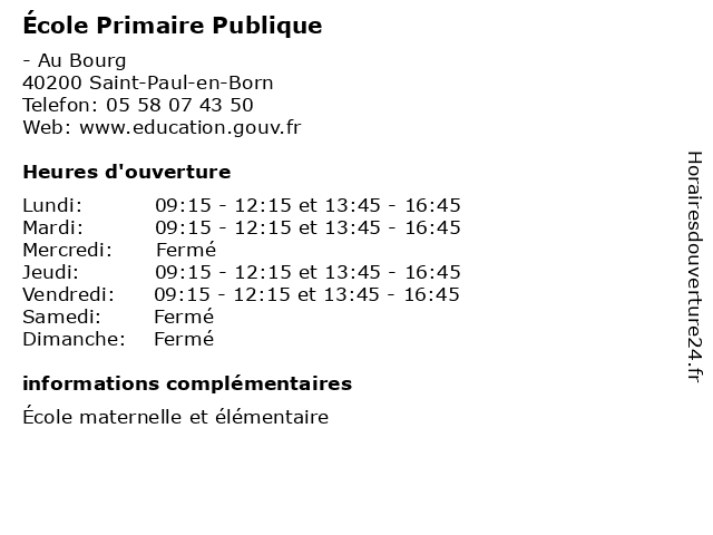 1 École Primaire Publique (Distance: 3,04 km) 48 Place du Général de Gaulle, 40200 Pontenx-les-Forges cours, education, primaire, publique, services, École, école 2 École Primaire Publique (Distance: 6,05 km) 104 Avenue du Born, 40200 Sainte-Eulalie-en-Born cours, education, primaire, publique, services, École, école 3 École Primaire Publique (Distance: 11,25 km) - Au Bourg, 40160 Gastes cours, education, primaire, publique, services, École, école 4 École Primaire Publique (Distance: 11,62 km) - Chemin départemental 44, 40210 Escource cours, education, primaire, publique, services, École, école 5 École Primaire Publique (Distance: 12,49 km) - Le Bourg, 40170 Bias cours, education, primaire, publique, services, École, école 6 École Primaire Publique (Distance: 16,46 km) - Le Bourg, 40170 Mézos cours, education, primaire, publique, services, École, école |
