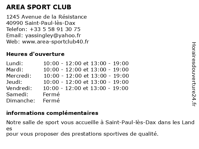 1 Piscine Océania Club (Période scolaire) (Distance: 0,95 km) 2128 avenue de la Résistance, 40990 Saint-Paul-lès-Dax club, natation sportive, océania, piscine, période, scolaire, sportif 2 Piscine Océania Club (Vacances scolaires) (Distance: 0,95 km) 2128 avenue de la Résistance, 40990 Saint-Paul-lès-Dax club, natation sportive, océania, piscine, scolaires, sportif, vacances 4 Dr François Weber - Médecin du Sport (Distance: 1,78 km) 51 boulevard Yves du Manoir, 40107 Dax cardio, cardiologie, cardiologue, centre, coeur, dax, dr, du, françois, hospitalier, médecin, sport, weber 5 Club Hippique De Dax Boulogne (Distance: 1,81 km) 9001 Allée de Boulogne, 40100 Dax boulogne, club, dax, de, hippique 6 |