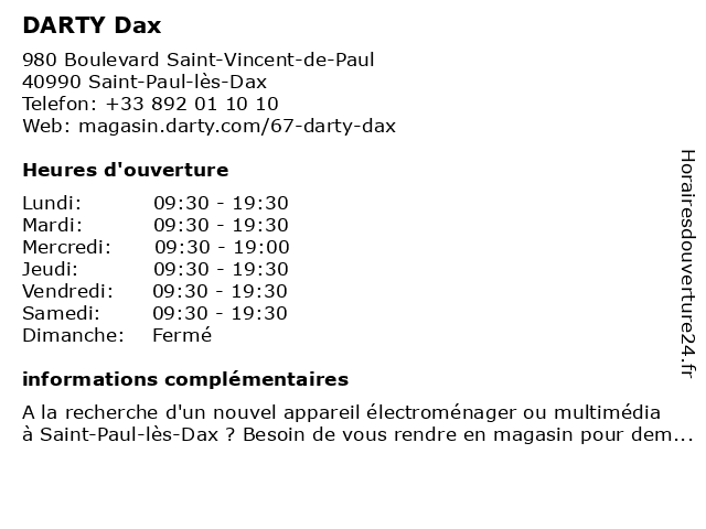 1 Darty (Distance: 0,24 km) - Boulevard Saint-Vincent-de-Paul, 40990 Saint-Paul-lès-Dax darty, internet, mobiles, téléphonie 2 Darty Cuisine Dax (Distance: 0,42 km) 980 Boulevard Saint-Vincent-de-Paul, 40990 Saint-Paul-lès-Dax cuisine, darty, dax 3 DARTY Capbreton Benesse-Maremne (Distance: 30,51 km) 2205 Route de Capbreton, 40230 Bénesse-Maremne benesse, capbreton, darty, maremne 5 Darty Orthez (Distance: 36,38 km) Soarns, 64300 Orthez darty, literie, matelas, matelas 140, matelas en mousse, matelas et sommier, matelas à ressorts, orthez, sommier relax 6 |