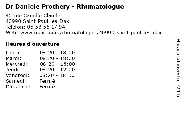 1 Dr Simona-Maria Gramada - Rhumatologue (Distance: 1,41 km) 1 Allée de Christus,, 40990 Saint-Paul-lès-Dax dr, gramada, maria, rhumatisme, rhumatologue, sante, simona, soins 2 Dr Bernard Maligne - Rhumatologue (Distance: 1,60 km) 7 Boulevard Carnot, 40100 Dax bernard, dr, maligne, rhumatisme, rhumatologue, sante, soins 3 SAUBUSSE THERMAL (Distance: 11,48 km) 150 Avenue des Bains, 40180 Saubusse cure thermale, hôtel bien-être, massage landais, médecine therrmale, phlébologie, remise en forme, rhumatologie, saubusse, sauna, séjour cure thermale, thermal, therme 4 Dr. Laurence Chalom - Rhumatologie (Consultation sur rendez-vous) (Distance: 41,91 km) 22 Aristide Briand, 64100 Bayonne chalom, consultation, docteur, dr., laurence, libre, medecins, rendez, rhumatologie, santé, sur, vous 5 Dr Alexia Hourdille - Rhumatologue (Distance: 43,56 km) 13 avenue de l'Interne Jacques Loëb, 64100 Bayonne alexia, consultation, docteur, dr, hourdille, med, médecin, médecine, rhumatologue, traitement 6 Dr Agnès Monnier - Rhumatologue (Distance: 43,56 km) 13 avenue de l'Interne Jacques Loëb, 64100 Bayonne agnes, agnès, consultation, docteur, dr, med, monnier, médecin, médecine, rhumatologue, traitement |