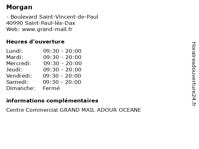 1 Morgan (Distance: 0,55 km) 234 Rue Maurice Menton, 40990 Saint-Paul-lès-Dax blazer femme, cardignan femme, chaussures femme, gilet femme, jean femme, magasin femme, magasin vêtements, manteau femme, mode femme, morgan, pull femme, robe femme, sac femme, t-shirt femme, tailleur femme, top femme, vêtements femmes 2 Groupe Morgan Services (Distance: 0,97 km) 27 Avenue de la Liberte, 40990 Saint Paul Les Dax agence, emplois, groupe, intérim, morgan, offres, services 3 DDP Woman (Distance: 0,00 km) - Boulevard Saint-Vincent-de-Paul, 40990 Saint-Paul-lès-Dax accessoires pour hommes, boutique, chaussures, ddp, mode, sacs, vetements, vetements pour femmes, woman 4 Celio* (Distance: 0,00 km) - Boulevard Saint-Vincent-de-Paul, 40990 Saint-Paul-lès-Dax accessoires pour hommes, boutique, celio*, chaussures, mode, sacs, vetements, vetements pour femmes 5 TroisPar3 (Distance: 0,00 km) - Boulevard Saint-Vincent-de-Paul, 40990 Saint-Paul-lès-Dax accessoires pour hommes, boutique, chaussures, mode, sacs, troispar3, vetements, vetements pour femmes 6 Klub'er (Distance: 0,00 km) - Boulevard Saint-Vincent-de-Paul, 40990 Saint-Paul-lès-Dax accessoires pour hommes, boutique, chaussures, klub'er, mode, sacs, vetements, vetements pour femmes |