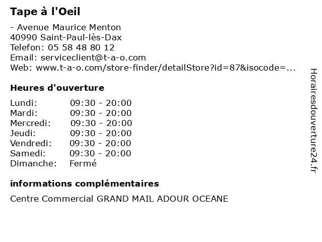 1 Tape à l'oeil - Saint-Paul-Lès-Dax (Distance: 0,50 km) Route De Mont De Marsan, 40990 Saint-Paul-Lès-Dax dax, l'oeil, lès, magasin de vêtements pour bébés, mode, paul, saint, tape 2 Clin d'Oeil Photo (Distance: 22,37 km) 23 Avenue nationale, 40230 Saint-Vincent-de-Tyrosse clin, d'oeil, photo 3 Tape à L'Oeil (Distance: 42,80 km) 2-4 Route du Portou, 64990 Saint-Pierre d'Irube enfants, l'oeil, magasin, prêt-à-porter, tape, vêtements 4 Tape à l'oeil - Saint-Pierre-D'Irube (Distance: 42,83 km) 2 Avenue Du Portou, 64990 Saint-Pierre-D'Irube d'irube, l'oeil, magasin de vêtements pour bébés, mode, pierre, saint, tape 5 Tape à l'Oeil (Distance: 46,00 km) 25 avenue Jean-Léon Laporte, 64600 Anglet accessoires, l'oeil, l'œil, mode, mode pour enfants, mode pour femmes, mode pour hommes, tape, vêtements pour enfants, vêtements pour femmes, vêtements pour hommes 6 Tape a L'Oeil (Distance: 47,13 km) . Mont de Marsan, 40990 Saint-Paul-les-Dax beaute, cafe, chaussures, enfants, hommes, l'oeil, lingerie, mode femmes, restaurant, sport, tape |