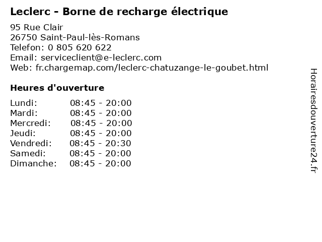 1 Leclerc - Borne de recharge électrique (Distance: 18,59 km) - Zone commerciale Les Gameux, 36260 Chatte borne, de, leclerc, recharge, électrique 2 E.Leclerc Parapharmacie (Distance: 0,03 km) 95 Rue clair, 26750 St Paul Les Romans e.leclerc, magasin de produits de soins capillaires, parapharmacie 3 E.Leclerc Location (Distance: 0,04 km) 95 rue Clair, 26750 Saint-Paul-lès-Romans automobile, e.leclerc, fourgon, leclerc, location, véhicule 5 E.Leclerc Parapharmacie (Distance: 0,15 km) 95 Rue Clair, 26750 St Paul Les Romans e.leclerc, parapharmacie, service, services, services à la personne 6 E.Leclerc Voyages (Distance: 0,15 km) 95 Rue Clair, 26750 Saint-Paul-lès-Romans e.leclerc, séjours, séjours vacances, voyages |
