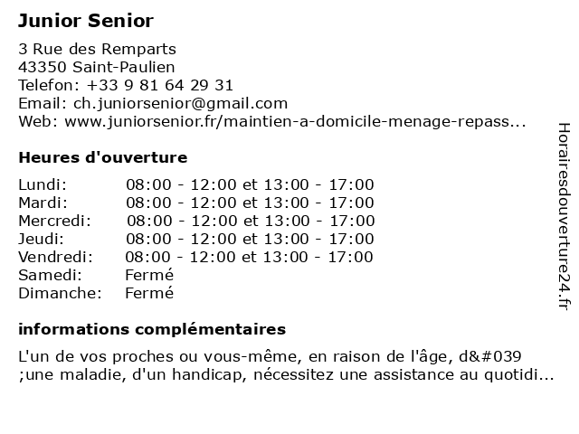 1 Résidence Services Seniors DOMITYS - La Sardonne (Distance: 11,57 km) 5 Rue Latour Maubourg, 43000 Le Puy-en-Velay appartement domitys, appartement indépendant senior, appartements pour retraités, domitys, la, location meublé résidence senior, logement privé residence senior, logements pour personnes âgées autonomes, maison senior location, meilleure residence senior, prix residence personne agee, prix résidence senior location, residence autonome, residence domitys, residence senior, residence senior domitys, residence senior france, residences services senior, résidence, résidence pour jeunes retraités, résidence senior tarif, sardonne, seniors, services, trouver residence senior, vivre en residence 2 Junior Calvet - Sage-femme (Distance: 21,92 km) 4b Rue du Commerce, 43500 Craponne-sur-Arzon calvet, du, femme, junior, maternité, périnée, rééducation, sage, uro-gynécologique 3 XandO - Women (Distance: 46,48 km) 70 rue Jean Jaurès, 42700 Firminy accessoires, and, chemises, junior, mode, pantalons, style, vetement, women, xando 4 LES MENUS SERVICES SAINT-ETIENNE (Distance: 51,38 km) 1 Rue Jean Baptiste Lully, 42230 Roche-la-Molière aide à domicile, etienne, les, les menus services, livraison repas senior, menus, ménage, portage repas senior, repas diabétique, repas mixé, repas sans sel, repas à domicile, saint, services, téléassistance 5 Résidence L'Hermitage - emeis (Distance: 55,56 km) 4 Rue Claudius Buard, 42100 Saint-Étienne activité physique adaptée, atelier thérapeutique, balnéothérapie, bien-être, convivialité, ehpad, emeis, ergothérapeute, infirmière, l'hermitage, maison de retraite, médecin, médiation animale, médicalisée, personnes âgées, psychologue, résidence, saint etienne, senior, snoezelen, soins, échanges intergénérationnels, équipe pluridisciplinaire 6 Résidence L'Hermitage - emeis (Distance: 55,56 km) 4 Rue Claudius Buard, 42100 Saint-Étienne activité physique adaptée, atelier thérapeutique, balnéothérapie, bien-être, convivialité, ehpad, emeis, ergothérapeute, infirmière, l'hermitage, maison de retraite, médecin, médiation animale, médicalisée, personnes âgées, psychologue, résidence, saint etienne, senior, snoezelen, soins, échanges intergénérationnels, équipe pluridisciplinaire |