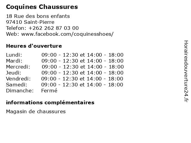 1 Coquines Chaussures (Distance: 0,03 km) 18 Rue des Bons Enfants, 97410 Saint-Pierre accessoires, boots, bottes, chaussures, coquines, sandales 2 Follee Chaussures (Distance: 0,00 km) 70 Rue des Bons Enfants, 97410 Saint-Pierre accessoires, boutique, chaussures, follee, mode 3 Unisa Chaussures (Distance: 0,13 km) 10 Bis Rue Archambaud, 49110 Saint-Pierre accessoires, boutique, chaussures, mode, unisa 4 Mangrolia Ilyas Chaussures (Distance: 0,15 km) 19 Rue des Bons Enfants, 97410 Saint-Pierre accessoires, boots, bottes, chaussures, ilyas, mangrolia, sandales 5 Mangrolia Chaussures Farouc (Distance: 0,18 km) 33 Rue des Bons Enfants, 97410 Saint-Pierre accessoires, boots, bottes, chaussures, farouc, mangrolia, sandales 6 Follee Chaussures (Distance: 0,26 km) 70 Rue des Bons Enfants, 97410 Saint-Pierre accessoires, boots, bottes, chaussures, follee, sandales |
