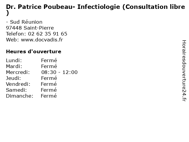 1 Dr. Patrice Poubeau- Infectiologie (Consultation sur rendez-vous) (Distance: 0,00 km) - Sud Réunion, 97448 Saint-Pierre consultation, docteur, dr., infectiologie, patrice, poubeau, rendez, santé, sur, vous 2 Dr. Gianandrea Borgherini - Infectiologie (Consultation libre) (Distance: 0,00 km) - Sud Réunion, 97448 Saint-Pierre borgherini, consultation, docteur, dr., gianandrea, infectiologie, libre, santé 3 Dr. Gianandrea Borgherini - Infectiologie (Consultation sur rendez-vous) (Distance: 0,00 km) - Sud Réunion, 97448 Saint-Pierre borgherini, consultation, docteur, dr., gianandrea, infectiologie, rendez, santé, sur, vous 4 Dr. Lise Francois- Médecine générale (Consultation libre) (Distance: 3,22 km) 131 rue du four à chaux, 97410 Saint Pierre consultation, docteur, dr., francois, générale, libre, lise, médecine, santé 5 Dr. Lise Francois- Médecine générale (Consultation sur rendez-vous) (Distance: 3,22 km) 131 rue du four à chaux, 97410 Saint Pierre consultation, docteur, dr., francois, générale, lise, médecine, rendez, santé, sur, vous 6 Dr. François Hoarau - Médecine générale (Consultation sur rendez-vous) (Distance: 3,22 km) 131 rue du four à chaux, 97410 Saint Pierre consultation, docteur, dr., françois, générale, hoarau, médecine, rendez, santé, sur, vous |
