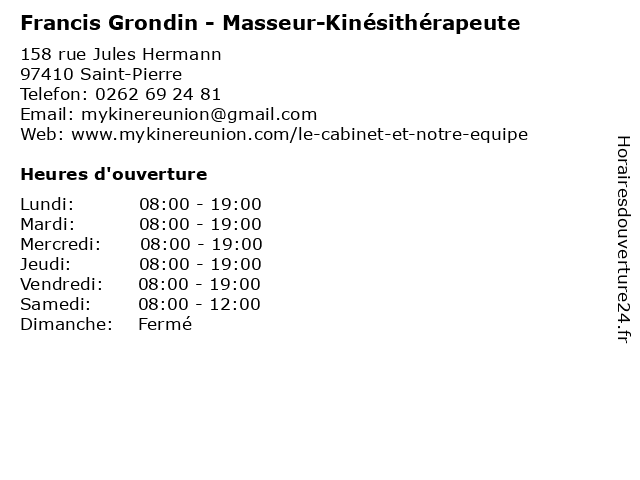 1 Dr Francis Molinari - Cardiologue (Distance: 2,52 km) 46 Boulevard Hubert Delisle, 97410 Saint-Pierre cardiologie, cardiologue, consultation, docteur, dr, francis, molinari, santé 2 Grondin Motos & Cycles (Distance: 11,31 km) 4 Chemin Antony Payet, 97418 Le Tampon cycles, grondin, motos 3 École primaire publique Francis Rivière (Distance: 12,12 km) 5 Rue Chabrier, 97427 L'Étang-Salé cours, francis, primaire, publique, rivière, servicios, école 4 École Elémentaire Publique Francis Rivière (Distance: 12,12 km) 5 Rue Chabrier, 97427 L'Étang-Salé cours, education, elémentaire, francis, https, publique, rivière, services, École, école, élémentaire 5 Mirella Grondin - Sage-femme (Distance: 47,69 km) - Allée des Topazes, 97400 Saint-Denis consultation, docteur, dr, femme, grondin, med, mirella, médecin, sage, traitement 6 Boucherie Charcuterie Grondin (Distance: 47,98 km) 7 Allée des Pierres de Lune, 97400 Saint-Denis alimentation, boucherie, charcuterie, commerce, grondin, réunion, saint-denis, traiteur, viandes |