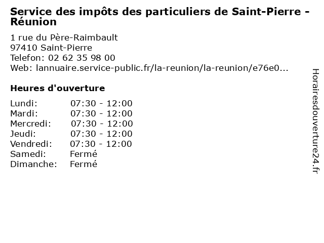 Termes de recherche pour Service des impôts des particuliers de Saint-Pierre - Réunion:de, saint, pierre, des, administration, service, reunion, particulier, impôts, particuliers, etat |