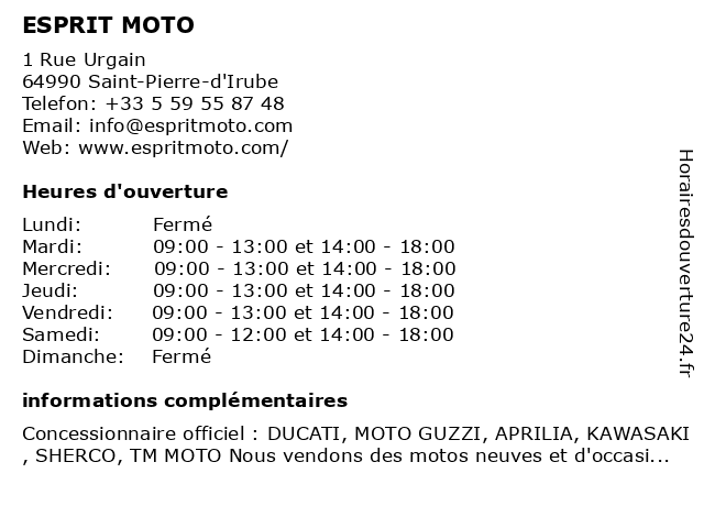 2 Moto Expert (1er avril au 30 septembre) (Distance: 2,83 km) 28 avenue du maréchal Juin, 64100 Bayonne 1er, 30, au, avril, boutique, expert, moto, septembre 3 Moto Expert (1er octobre au 31 mars) (Distance: 2,83 km) 28 avenue du maréchal Juin, 64100 Bayonne 1er, 31, au, boutique, expert, mars, moto, octobre 4 McDonald's Bayonne Saint Esprit (Distance: 2,91 km) - Route d'Arroussets, 64100 Bayonne bayonne, burgers, esprit, fast, food, hamburgers, mcdonald's, rapide, restaurant, restauration, saint 5 Esprit Coquette Institut (Distance: 3,51 km) 154 impasse Mendilaskor, 64990 Mouguerre beauté, coquette, esprit, institut, manucure, massage, soins, épilation 6 Auto Moto Ecole Castelain (Distance: 3,87 km) 32 Place des Basques, 64100 Bayonne auto, castelain, ecole, moto, permis |