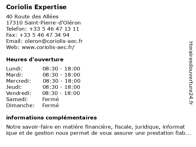 1 Fiducial Expertise (Distance: 0,28 km) 13 Avenue de Bel air, 17310 Saint-Pierre-d'Oléron expertise, fiducial 2 Coriolis Telecom (Distance: 0,51 km) 65 Avenue Du Bel Air, 17310 Saint Pierre d’Oleron achats, coriolis, magasin, mobile, réseau, smartphone, telecom, téléphonie 3 Atlantique Expertise Comptable (Distance: 0,92 km) 147 Route des Châteliers, 17310 Saint-Pierre-d'Oléron atlantique, comptable, expertise 5 Coriolis Telecom (Distance: 5,03 km) - Route Départementale 734, 17310 Saint Pierre d'Oleron coriolis, internet, mobile, telecom, téléphone 6 Cerfrance - Conseil & Expertise comptable à Bourcefranc Le Chapus (Distance: 17,60 km) 7 Rue René Normandin, 17560 Bourcefranc-le-Chapus bourcefranc, cerfrance, chapus, comptable, conseil, expertise, le |