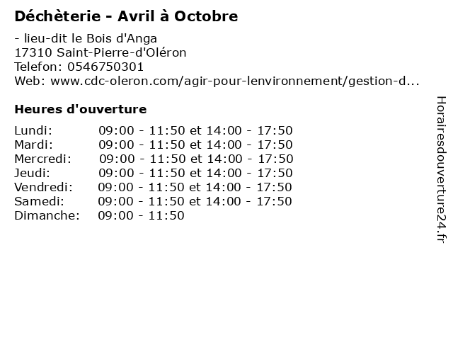 1 Déchèterie - Avril à Octobre (Distance: 10,67 km) - lieu-dit La Royale, 17840 La Brée-les-Bains avril, cartons, déchets, déchèterie, gravats, octobre 2 Déchèterie - Novembre à Mars (Distance: 0,00 km) - lieu-dit le Bois d'Anga, 17310 Saint-Pierre-d'Oléron cartons, déchets, déchèterie, gravats, mars, novembre 3 Musée de l’île d’Oléron (Avril à Juin, Septembre, Octobre) (Distance: 2,63 km) 9 place Gambetta, 17310 Saint-Pierre d'Oleron avril, collections permanentes, de, d’oléron, juin, l’île, musée, octobre, reserve museale, septembre 4 Déchèterie - Novembre à Mars (Distance: 6,29 km) - lieu-dit Fontembre, 17480 Château-d'Oléron cartons, déchets, déchèterie, gravats, mars, novembre 5 Déchèterie - Novembre à Mars (Distance: 10,67 km) - lieu-dit La Royale, 17840 La Brée-les-Bains cartons, déchets, déchèterie, gravats, mars, novembre 6 Déchèterie (Hiver) (Distance: 17,22 km) - Lieu-dit La Levée, 17450 Saint-Laurent-de-la-Prée bennes, collecte, déchets, déchèterie, détritus, hiver, poubelles |