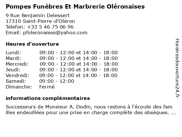 1 Pompes funèbres PFG SAINT-PIERRE-D'OLÉRON (Distance: 0,25 km) 15 Rue de la République, 17310 Saint-Pierre-d'Oléron avis de décès, crémation, d'oléron, entretien de sépulture, fleurs deuil, formalités après obsèques, funèbres, inhumation, marbrerie, monument funéraire, pfg, pierre, pompes, pompes funèbres, prévoyance obsèques, saint 2 Pompes Funèbres Martin Oléron (Distance: 5,50 km) Route de l'Ecuissière, 17550 Dolus-d'Oléron funèbres, martin, oléron, pompes 3 Pompes Funèbres Martin (Distance: 5,50 km) - Le Fief de la Jarrie, 17550 Dolus-d'Oléron funèbres, funérailles, martin, obsèques, pompes, pompes funèbres 4 Pompes funèbres PFG BOURCEFRANC-LE-CHAPUS (Distance: 17,60 km) Rue Maxime Davy, 17560 Bourcefranc-le-Chapus avis de décès, bourcefranc, chapus, crémation, entretien de sépulture, fleurs deuil, formalités après obsèques, funèbres, inhumation, le, marbrerie, monument funéraire, pfg, pompes, pompes funèbres, prévoyance obsèques 5 Pompes Funèbres Gabet (Distance: 17,86 km) 66 Rue de la Fée au Bois, 17450 Fouras funèbres, gabet, pompes 6 Pompes Funèbres Roc-Eclerc (Distance: 24,32 km) 1 Avenue des Fourneaux, 17690 Angoulins articles funéraires, assistance rapatriement, démarches admnistratives, eclerc, fleurs fraîches, funèbres, gestion des obsèques, pompes, prévoyance obsèques, roc, travaux de marbrerie et cimetière |