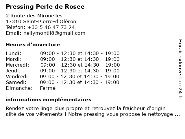| Mercredi | 09:00-12:30 et 14:30-19:00 |