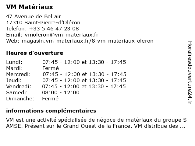1 Vm Materiaux (février à novembre) (Distance: 0,39 km) 47 Avenue de Bel Air, 17310 Saint-Pierre-d'Oléron constructives, equipements, février, materiaux, novembre, services, vm 2 Vm Materiaux ( novembre à février) (Distance: 0,39 km) 47 Avenue de Bel Air, 17310 Saint-Pierre-d'Oléron constructives, equipements, février, materiaux, novembre, services, vm 3 Chausson Matériaux (Distance: 0,64 km) 29 Avenue du moulin blanc, 17310 St.Pierre D'Oleron chausson, matériaux 4 CEMEX Matériaux, unité de production béton de Dolus-d'Oléron (Distance: 3,07 km) 87 Rd 734, 17550 Dolus-d'Oléron béton, cemex, d'oléron, de, dolus, fournisseur de matériel pour le béton, matériaux, production, unité 5 CEMEX Matériaux, dépôt de Dolus-d'Oléron (Distance: 3,07 km) Route De Saint-pierre, 17550 Dolus-d'Oléron cemex, d'oléron, de, dolus, dépôt, fournisseur de béton, matériaux 6 Chausson Matériaux (Distance: 9,09 km) Rn 734 la beaucoursiere, 17480 Le Chateau D'Oleron chausson, matériaux |