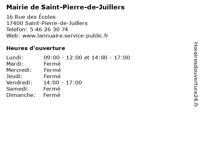 1 Mairie de Saint-Martin-de-Juillers (Distance: 2,25 km) 16 Rue des Écoles, 17400 Saint-Martin-de-Juillers administration, assoc public, de, juillers, mairie, martin, saint 2 Mairie de Paillé (Distance: 5,26 km) 46 Rue des Prairies, 17470 Paillé administration, assoc public, de, mairie, paillé 3 Mairie de Cherbonnières (Distance: 8,26 km) 3 Rue de la Mairie, 17470 Cherbonnières administration, assoc public, cherbonnières, de, mairie 4 Sous-Préfecture (Distance: 10,01 km) 28 Place de l'Hôtel de ville, 17415 Saint-Jean-d'Angély administration, prefecture, préfecture, public, sous 5 Mairie de Saint-Jean-en-Royans (Distance: 10,08 km) . Place de l'Hôtel-de-Ville, 26190 Saint-Jean-en-Royans administration, assoc public, de, en, jean, mairie, royans, saint 6 Mutualité sociale agricole (MSA) Charentes (Distance: 10,13 km) 4 Rue Rose, 17400 Saint Jean d'Angely accueil, administration, agricole, assoc, charentes, msa, mutualité, services, services publics, sociale, téléphonique |