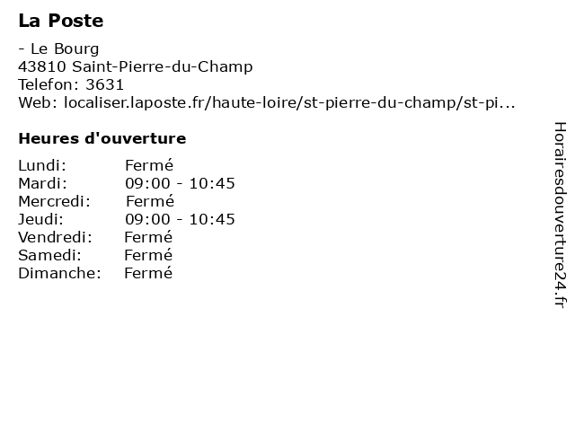 1 La Poste (Distance: 5,65 km) Le Bourg, 43500 Saint-Georges-Lagricol agence, assurance, banque, banque postale, bureau de poste, chronopost, colis, courrier, dps, expéditions internationales, la, point, postale, poste, relais, timbres, téléphonie, ups, western union 2 La Poste (Distance: 5,99 km) Le Bourg, 43500 Chomelix agence, assurance, banque, banque postale, bureau de poste, chronopost, colis, courrier, dps, expéditions internationales, la, point, postale, poste, relais, timbres, téléphonie, ups, western union 4 La Poste (Distance: 8,48 km) - Le Bourg, 43810 Saint Pierre du Champ colis, express chronopost, expédition, la, poste, réexpédition internationale, service, suivi du courrier 5 La Poste (Distance: 8,49 km) Le Bourg, 43800 Chamalières-sur-Loire agence, assurance, banque, banque postale, bureau de poste, chronopost, colis, courrier, dps, expéditions internationales, la, point, postale, poste, relais, timbres, téléphonie, ups, western union 6 La Poste (Distance: 10,69 km) - Place de la Vialle, 43800 Beaulieu colis, express chronopost, expédition, la, poste, réexpédition internationale, service, suivi du courrier |