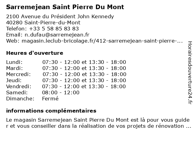 1 Sarremejean Saint Sever (Distance: 12,61 km) 2 Route de Grenade, 40500 Saint-Sever saint, sarremejean, sever 2 Sarremejean Pontonx Sur L'Adour (Distance: 34,77 km) 495 Chemin de l'Herté, 40465 Pontonx-sur-l'Adour l'adour, pontonx, sarremejean, sur |