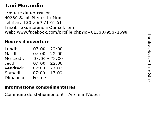1 Taxi Landes Passion (Distance: 2,10 km) 13 Impasse Roger Vallois, 40000 Mont-de-Marsan landes, passion, taxi 2 Taxi Agglo de Mont de Marsan Dominique Mondenx (Distance: 5,52 km) 647 Route de Saint-Christau, 40280 Benquet agglo, de, dominique, marsan, mondenx, mont, taxi 4 Adour Taxi Baccarrere (Distance: 12,99 km) 71 Rue René Vielle, 40270 Grenade-sur-l'Adour adour, baccarrere, taxi 5 Taxi Baccarrère SARL (Distance: 13,80 km) 1 Rue Arnaud de Moles, 40500 Saint-Sever baccarrère, sarl, taxi 6 |