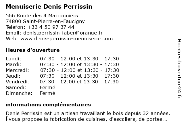 1 Besson Denis (Distance: 1,77 km) Ld l Echo Des Montagnes, 74800 St Laurent besson, denis, restaurants 2 Menuiserie Contat (Distance: 1,86 km) 164 Rue de Danguy, 74800 Saint-Pierre-en-Faucigny contat, menuiserie 3 Jp Palumbo Menuiserie Charpente (Distance: 5,00 km) 220 Route du Clos du May, 74800 Etaux charpente, jp, menuiserie, palumbo 4 Boucherie Charcuterie Traiteur Raibon Denis (Distance: 7,30 km) 123 Route d'Annemasse, 74130 Contamine-sur-Arve alimentation, boucher, boucherie, charcuterie, charcutier, commerce, contamine-sur-arve, denis, raibon, traiteur, viandes 5 AMD - Agencement Menuiserie Dumas (Distance: 9,06 km) - La Glacière, 74570 Evires agencement, amd, dumas, générale, menuiserie 6 |